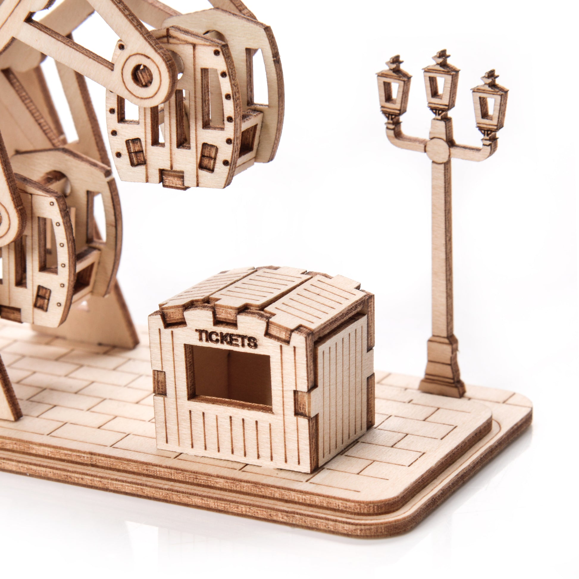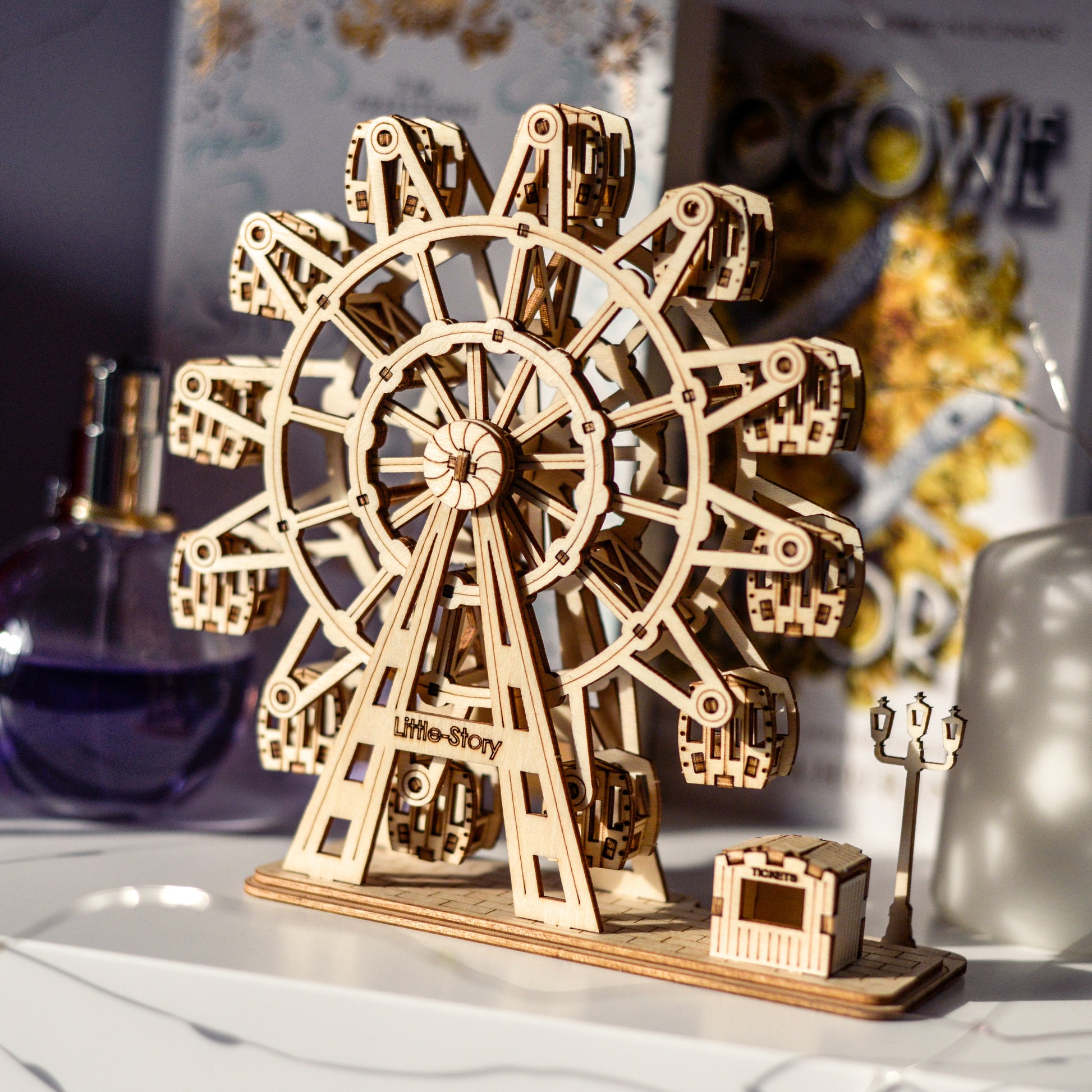 Ta drewniana układanka 3D ma kształt diabelskiego młyna, oferując zabawne i edukacyjne doświadczenie budowlane. Zestaw zawiera wysokiej jakości arkusze sklejki z wstępnie wyciętymi, ponumerowanymi częściami. Wystarczy odłączyć elementy od wyciętych arkuszy, a następnie złożyć je bez kleju, postępując zgodnie z dostarczonymi instrukcjami krok po kroku. Nie tylko służy jako angażująca układanka, ale także przekształca się w piękny element dekoracyjny po ukończeniu.
